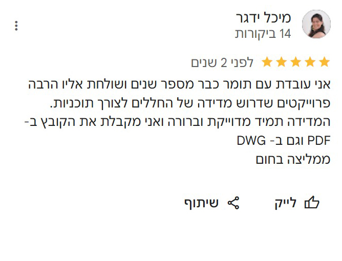 אנו מתמחים בביצוע מדידות מקצועיות ואיכותיות באמצעות סורק. כך שהתוצר המתקבל הוא: קובץ אוטוקאד DWG, מחולק לשכבות לפי התקן, מה שנותר זה רק לפתוח את הקובץ ולהתחיל לעבוד.